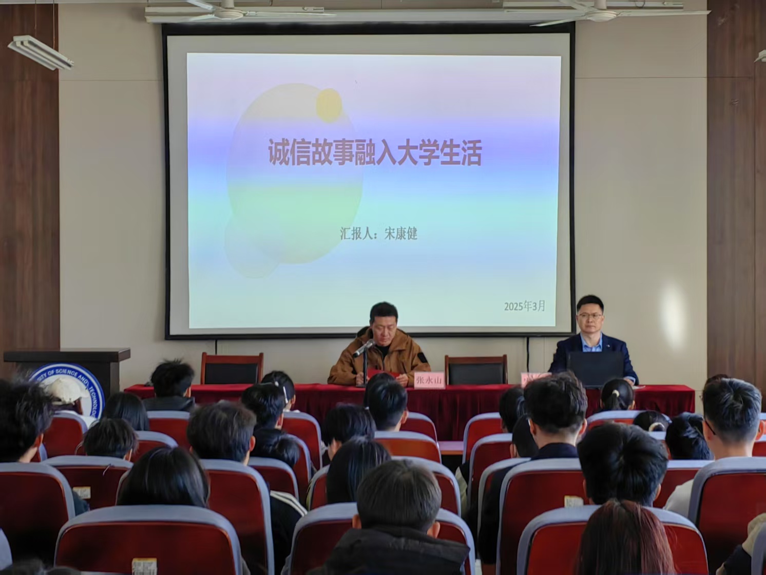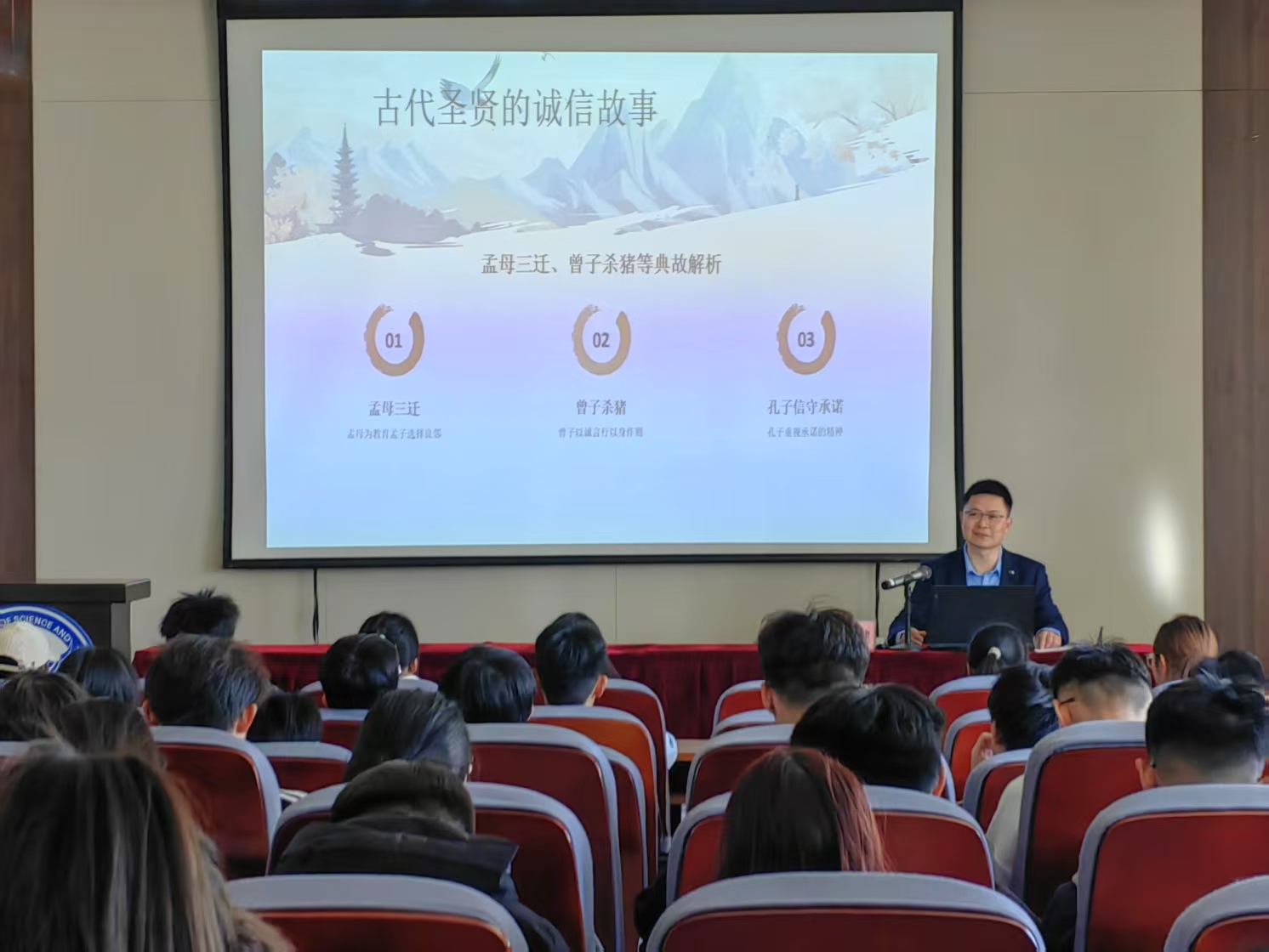 随后,宋教授深入剖析了“诚信之脉”,详细阐述诚信如何贯穿中国历史发展,成为维系社会秩序的重要准则。他通过历史典故和现实案例,深入浅出地讲解诚信在社会生活中的重要作用,使同学们对诚信有了更加全面和深入的理解。