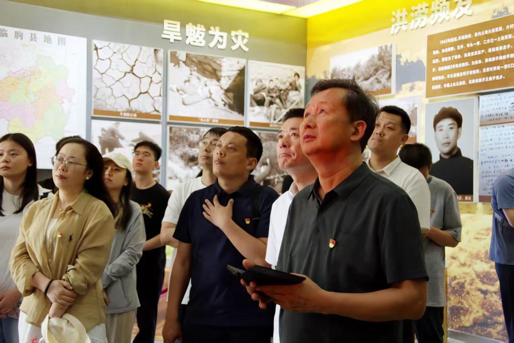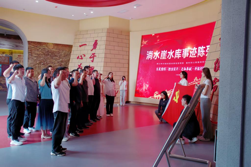 活动伊始,师生党员走进淌水崖水库陈列馆,在展厅中央的鲜红党旗下庄严列队。建筑工程学院党委书记刘增武领誓,全体党员高举右拳,面向党旗重温入党誓词。铿锵誓言与馆内“自力更生、艰苦奋斗”的标语交相辉映,党徽在陈列的历史照片与锈迹斑斑的施工工具映衬下熠熠生辉。