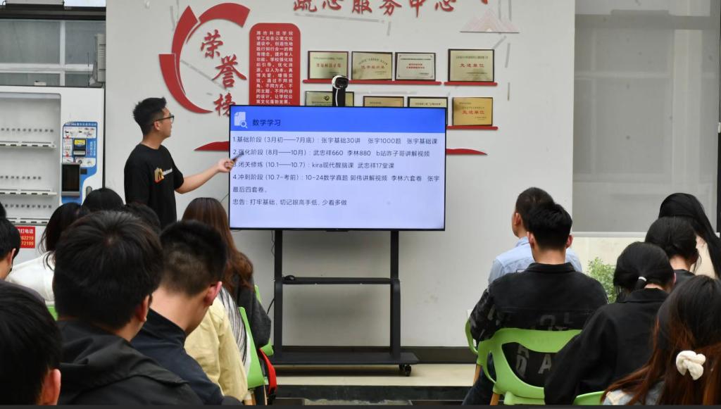 备考方法论是分享会的另一大亮点。四位同学系统且全面地分享了各科目行之有效的学习方法与策略。在英语提升方面,他们强调单词积累的重要性,并推荐了多款单词软件和课程。政治复习方面,他们建议关注时效性,利用思维导图梳理知识体系,提升答题技巧。同时,他们还强调时间管理和心态调适的重要性,为自制力欠佳的同学推荐了学习软件。