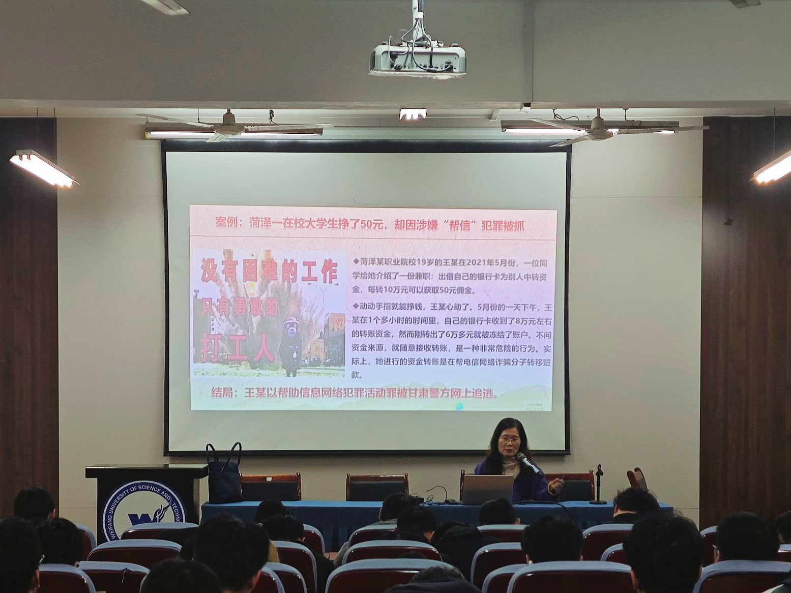 讲座中,郭秋玲以“案例+解读”的形式,结合“帮信”等贴近大学生日常生活的真实案例,并剖析非法收购、猎捕珍贵野生动物等常见违法犯罪行为的法律后果,明确大学生需规避的法律风险点,同时引导学生树立“知法、守法、用法”的法治观念,学会用法律武器维护自身合法权益。